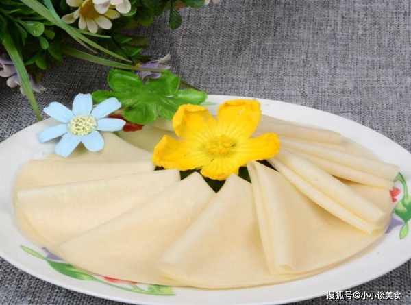3、把豆浆皮铺在案板上切成中等大小的块,把搅好的豆沙拌入肉末,均匀地铺在豆腐皮上,卷成卷状