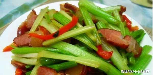 2、最后倒入胡萝卜细条,翻炒,加水焖1分钟;倒入芹菜翻炒至芹菜变色,加少许盐调味,培根会更咸,少放盐,最后倒入芹菜叶,搅拌均匀即可出锅。