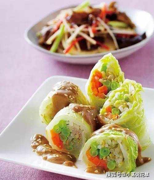 -材料-白菜叶2片,绿豆50克,胡萝卜60克,绿豆芽50克,香菜3支,盐少许,香油1汤匙,芝麻酱1茶匙,少许白胡椒粉和1茶匙白芝麻