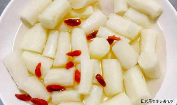 做法:1、大白萝卜去皮后,切成盘子,放入开水锅中煮熟捞出待用。
