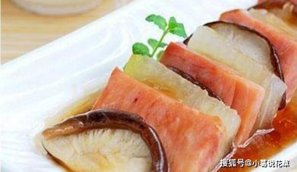 2、火腿切成0.5厘米厚的片,和蜡南瓜一样大小。3、新鲜香菇洗净,用热水泡一会,捞出,按大小对半切开。
