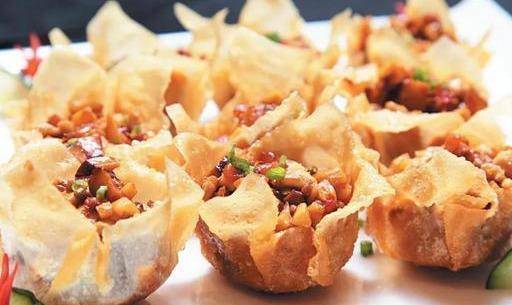 2.干净的锅里放油烧热,放入调味好的河虾和切好的油,起锅。将面团揉成碗状,放入油锅中炸至成型,呈金黄色,捞出沥油,装盘。