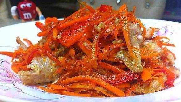 3、油烧热,加入盐、葱、蒜和油炒匀,然后加入猪肉和胡萝卜一起翻炒,最后放鲜味露、酒、生粉水和清水勾芡,炒匀即可上桌。