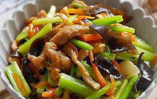 配料:芹菜2条,瘦猪肉200克,黑蘑菇2朵,胡萝卜1/2根,生姜3片,大蒜2瓣,盐1茶匙,鸡精1/2茶匙,鸡精1/2汤匙料酒、酱油1汤匙、生粉1/2汤匙