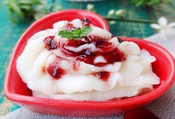材料:山药2条、白醋一茶匙、桂花酱适量