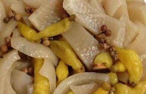 原料:猪皮300克,泡椒十五个,小米椒四个,葱少许,小葱一个,姜少许,蒜头四瓣,香油少许,醋适量,酱油两匙,盐少许,当归少许,桂皮粉少许,料酒少许