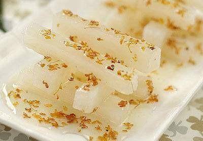 2、锅内加水,将山药放入锅中,中火煮3-4分钟,捞出凉水,沥干水分,装盘倒入桂花。