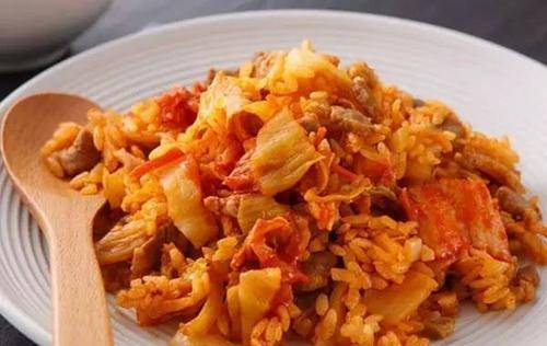 食材:米饭一碗、韩国泡菜100克、韩式辣酱2勺、腌萝卜、火腿适量。葱、猪油、食用油