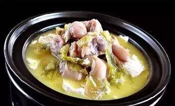 2、锅里放化猪油和色拉油烧热,先下姜片、葱段、泡青菜丝和野山椒炒香,掺鲜汤并加盐、味精、鸡精和胡椒粉调味,再倒进高压锅,放入猪手块后上火压至脱骨待用。