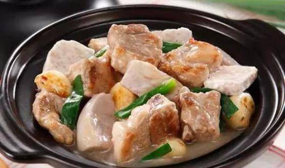 食材:小排骨300克、芋头400克、蒜2瓣、酒1大匙、酱油1/2大匙、酱油1/2大匙、盐1/2茶匙、糖1茶匙、胡椒粉少许