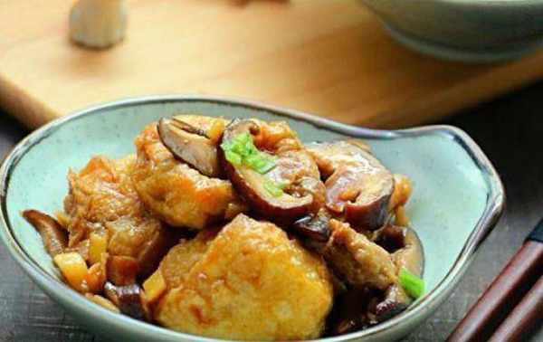 5、锅留余油,爆香姜蒜末,炒香香菇,放入豆腐泡略微翻炒;