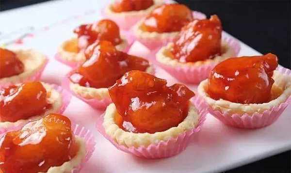3.将番茄酱、糖、盐和红醋放入锅中调成糖醋汁,加入炸好的虾球拌匀,最后将裹着糖醋汁的虾球放入蛋挞壳中,服务.做
