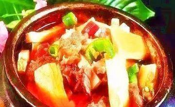 3、把自制豆花放煲里垫底,倒入压好的猪手块和原汤便可上桌。