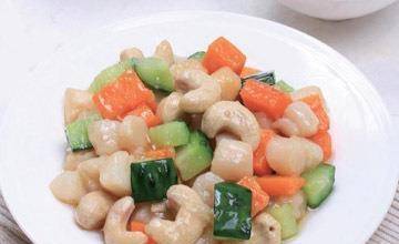 2、油锅烧热,爆香姜片,倒扇贝肉、胡萝卜丁和黄瓜丁煸炒,加盐、熟腰果炒匀,用水淀粉勾芡即可。