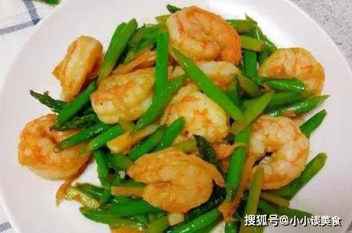 原料:芦笋、虾仁、料酒、花椒、姜、蒜、盐、食用油。
