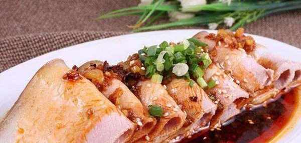 4.胡萝卜皮横放四周是为了让肉质更美观。然后将肉切成薄片。姜、蒜切碎,加入适量的盐将蒜块打碎。加入2-3勺水拌匀,再加入5勺辣椒油、3勺生抽、半勺花椒油、2勺糖和适量的柠檬汁拌匀。