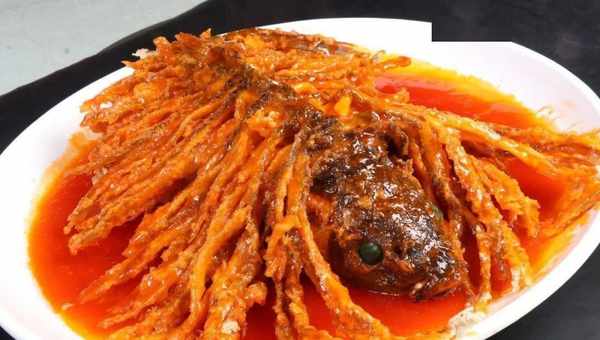 金毛狮子鱼主要是选用成年鲤鱼作为食材的原料,金毛狮子鱼通过将鲤鱼切成片,然后再用油炸,在淋上用番茄酱、糖、醋等制作而成的糖醋汁翻炒均匀口感酥脆酸甜,鱼肉酥美入味,非常好吃。