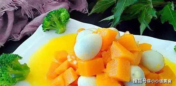 2、锅中放入香油烧热,放入南瓜块略炒,加入水和鹌鹑蛋,煮8分钟至汤汁变甜,加入盐和味精,煮熟。3分钟。