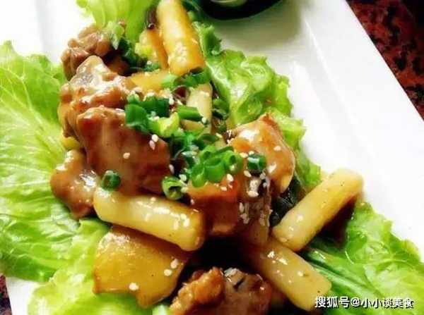 4、加水,至少没过排骨,加入蒜、姜、姜、八角、桂皮,加入料酒,大火煮,继续煮10分钟,加少许盐,继续煮。;5.汤汁收至2/3时,加入年糕,煮至汤汁软甜,汤汁浓稠肥腻;