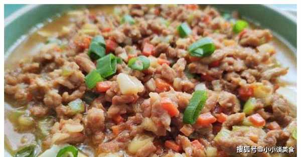 4、锅内加油,爆香葱花、蒜末,加入肉末炒至变色,加入青椒和胡萝卜碎,加盐、生抽拌匀,加水盖上锅盖。到锅里炖5分钟。5.取出蒸好的豆腐蛋沫,把肉末酱淋在豆腐蛋沫上,好吃。