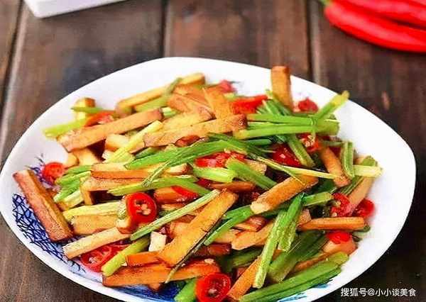 原料:豆腐干150克,芹菜75克,胡萝卜10克,盐6克,味精5克,花椒油10克,十三香5克。