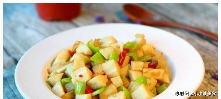 4、炒至莲藕丁表面变色,加入香醋快速炒至光滑,加入青椒和盐,搅拌调味,即可熄火上桌;