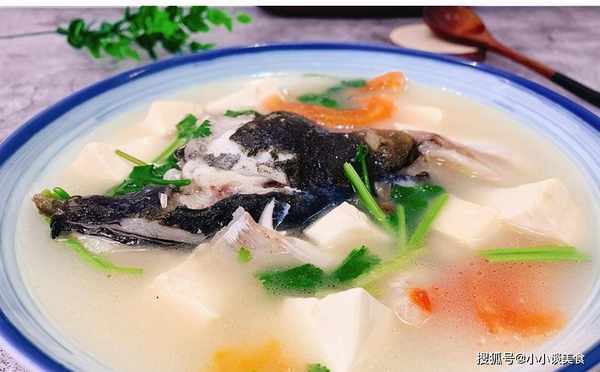 材料:鱼头、豆腐、番茄、香菜、青酒、盐、鸡精、食用油;
