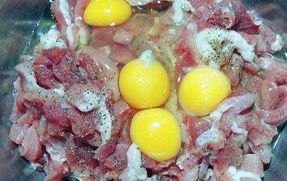 猪肉先切成片,再切成条,比手指再细一点就可以了。依次加入鸡蛋、黑胡椒(比料酒好用多了)、盐搅拌均匀,记着要一个方向搅拌。