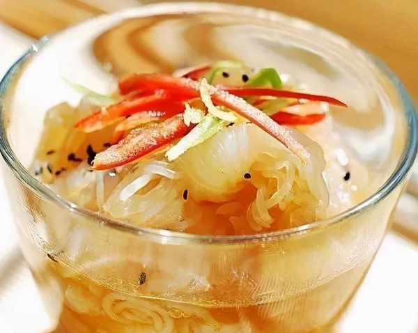 1、面最好用红薯粉,龙口粉也可以;将面条的长端浸泡在沸水中直至变软。