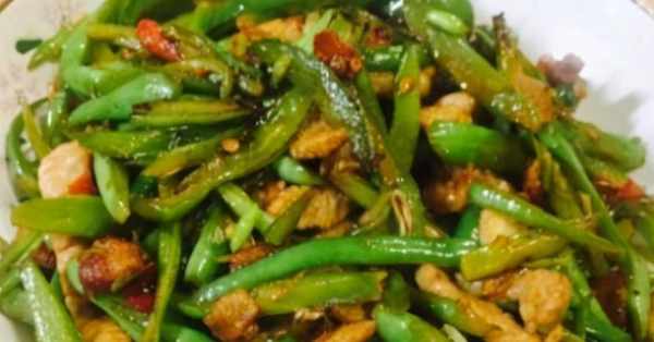 3.加入切碎的豆角翻炒,不断搅拌,直到切碎的豆角变软,然后加入盐。磨碎的豆角煮不好会中毒,不妨多炒一会试试。