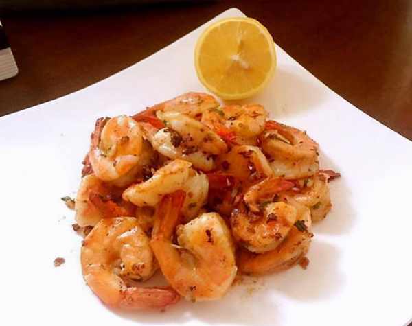 4.快炸至虾变红卷曲。加一点柠檬汁,摇两下就完成了。(虾从入锅到出锅不超过五分钟。)装盘,可以再撒点意大利调料。