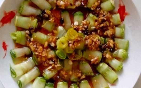 2.黄瓜洗净,压扁切成小块,加盐腌一会
