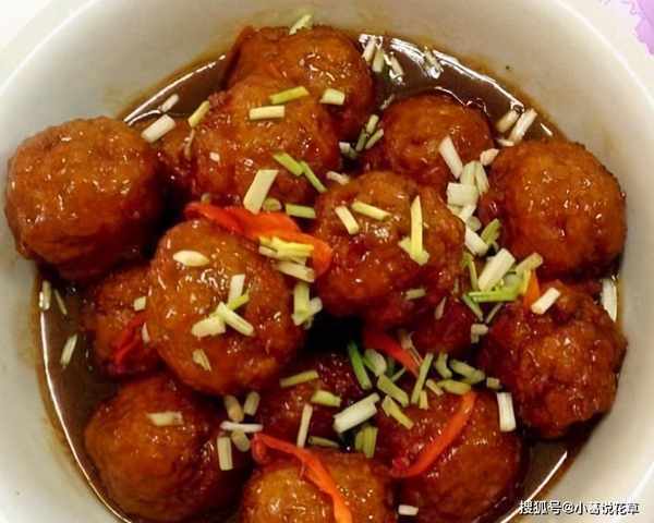 4.倒入所有油,然后将丸子放回锅中;加入生抽和老抽,拌匀,然后倒入清水;煮一段时间后,加少许糖调味;加水淀粉勾芡,关火起锅;与切碎的洋葱一起食用;