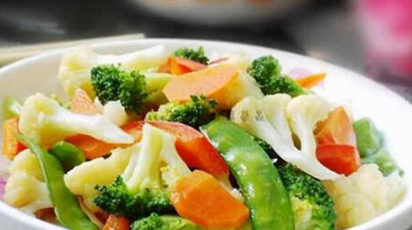 材料:西兰花、花菜、胡萝卜、灯笼椒、荷兰豆、蒜片、白砂糖、水淀粉、盐、油。