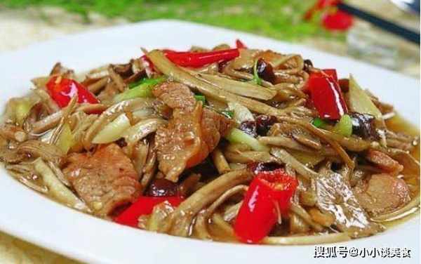 1.茶树菇洗净去老根,用淡盐水浸泡,猪肉切片;