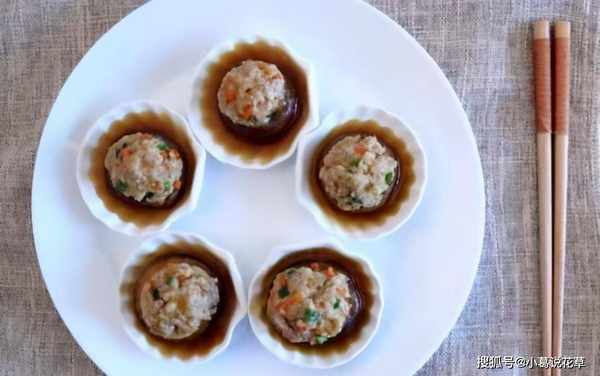 5、将肉末揉成丸子,放入香菇中,挤好,装盘,上面放上洗净的枸杞。