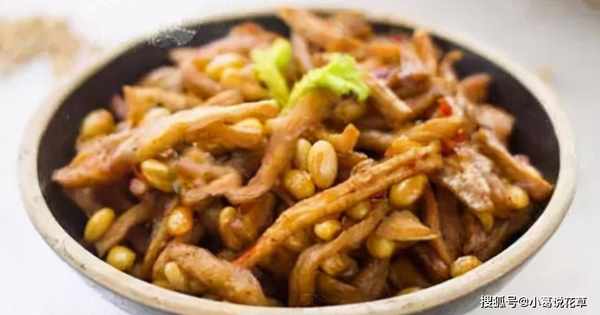 4、加入黄豆翻炒两分钟,加入酱油提鲜,加少许水,用小火慢炖一会,即可起锅。