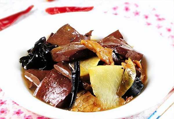 4.加入适量的开水,烧开后,加入香菇和焯过的猪血,煮2分钟,加入白萝卜片炒至顺滑。