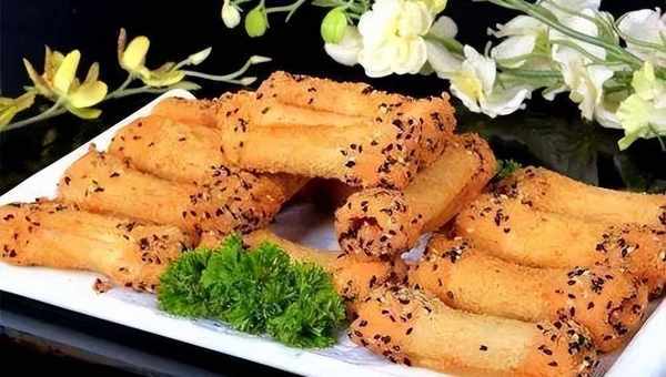 材料:小芋头1个,去皮洗净,正方形面包片1包。白糖2两、盐1克、面粉1两、黑芝麻少许。