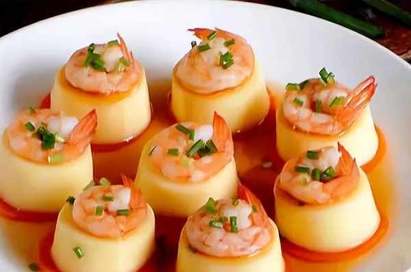 4.将玉米豆腐放在胡萝卜片和虾上。