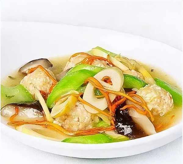 8、锅内留少许精制油,放入姜片炒香,加入香菇片和笋片翻炒,加入少许菜汤,加入冬瓜和素虾丸拌匀。调味盐,香菇精,略煮开,加少许稀酱,出锅装盘。