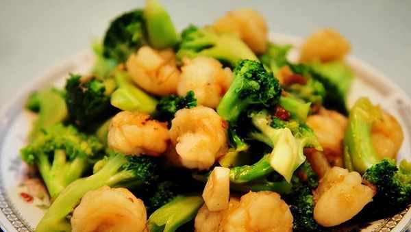 3、锅内倒入少许油,放入切碎的蒜头和虾仁翻炒至变色,再加入西兰花炒匀即可。