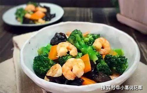 材料:西兰花190克,虾仁80克,红萝卜40克,黑菇适量,油1茶匙,盐1茶匙,料酒1茶匙,蚝油1茶匙