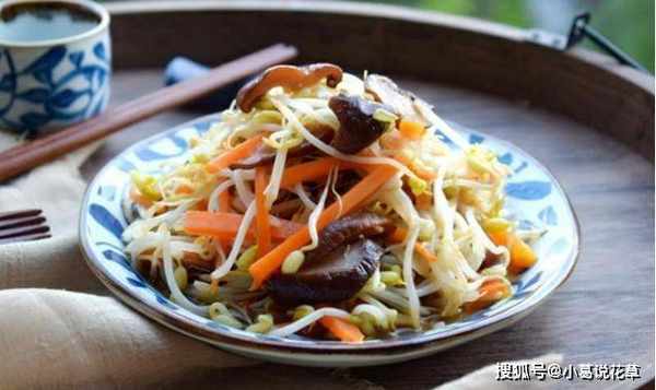 材料:绿豆芽250克、香茹10根、红萝卜半根、姜丝1勺盐、素蚝油2勺