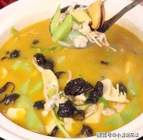 贻贝、文蛤、蛏子、竹笋和广东生瓜一起做成这道半汤菜,用料丰富,色泽鲜黄,味道鲜美。它闻起来有鱼腥味。