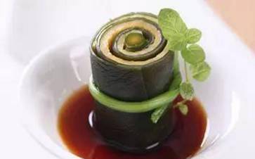 2、铺上煮好的海带,铺上蛋壳,放上芦笋片,卷起来,扎上香菜。盛入盘中,佐酱油食用