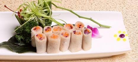 3、吃的时候,铺上薄饼皮,铺上紫菜干、香菜、肉丝、花生片、白蒜片、辣椒酱,再铺上薄饼馅,擀成圆筒状。.