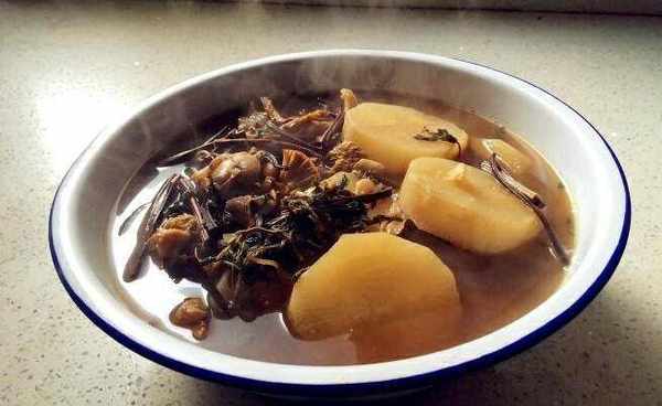 材料:白萝卜1个,猴头菇4-5个,松茸4-5个,干蕨菜一小把,食用油,生姜一片,盐适量。
