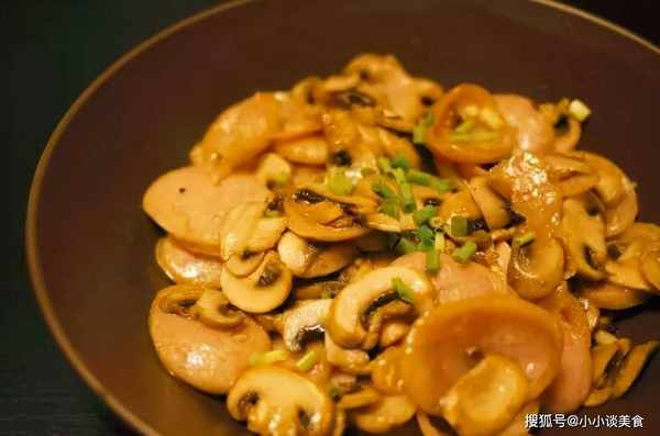 3.搅拌至香菇变软,水容易出的时候加少许盐,放入切好的蒜香肠,搅拌至蒜香肠微微卷起,撒上一些小葱即可食用!