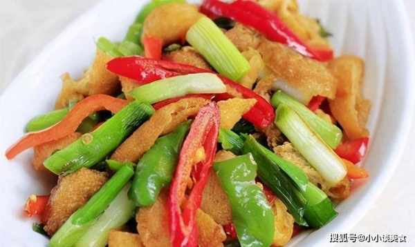 2.热一锅冷油,加入切碎的姜和辣椒炒香,加入油豆腐,加入蒜苗炒香,约两分钟。